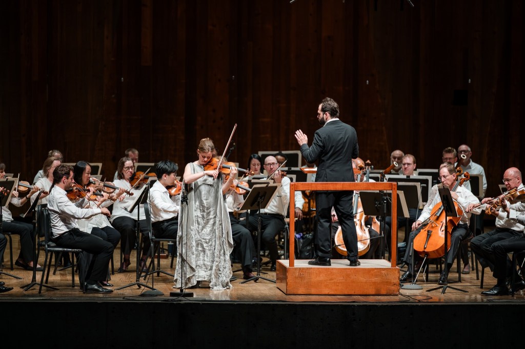 With young Czech conductor Petr Popelka on the podium, German violin phenom Veronika Eberle tackled one of the monuments of her instrument’s repertoire, Beethoven’s Violin Concerto. Twice as long as any similar work of the period, the Concerto stands out for its focus on cooperation between soloist and orchestra instead of contention. Eberle proved more than equal to the broad, lyrical span of the work, graciously in tune with her colleagues through the Allegro’s subtle, sonorous build, the Larghetto’s placid thematic variations and the vivacious, folksy Rondo. A well-deserved standing ovation led to Eberle dashing off a Bartok duet with concertmaster Joel Link. Then Popelka proved himself a maestro to watch and hear with a sprightly, energetic reading of Schumann’s “Spring” Symphony. Music, audience and surroundings came together for a thoroughly delightful evening. The rain that had threatened throughout even held off until after the concert!