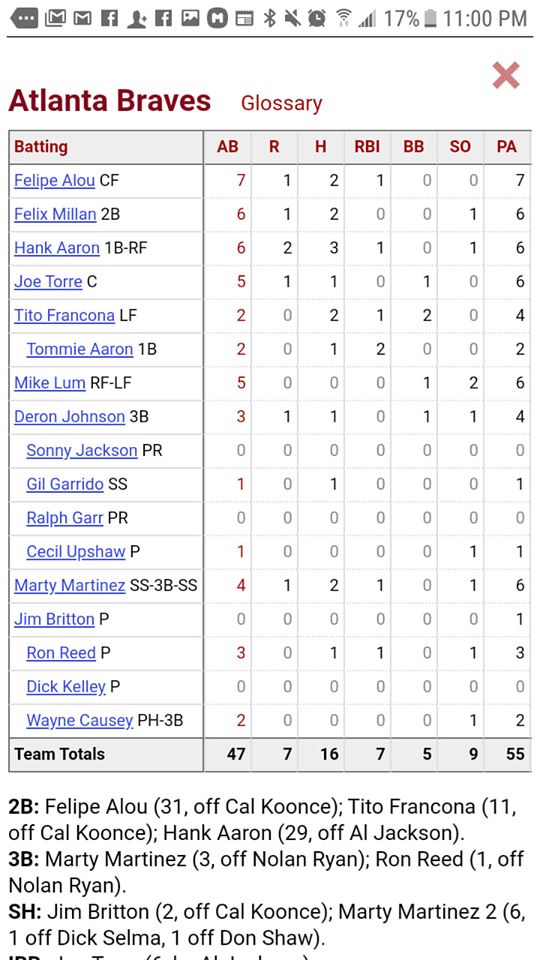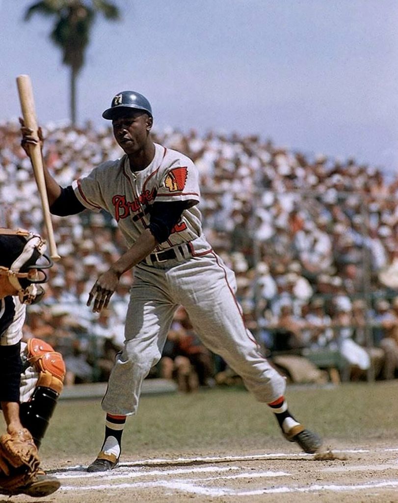 The first man walked and the second man struck out. Then the announced him: “NOW BATTING, number 44 Hank Aaron”: Hank was all business at bat. No distractions.