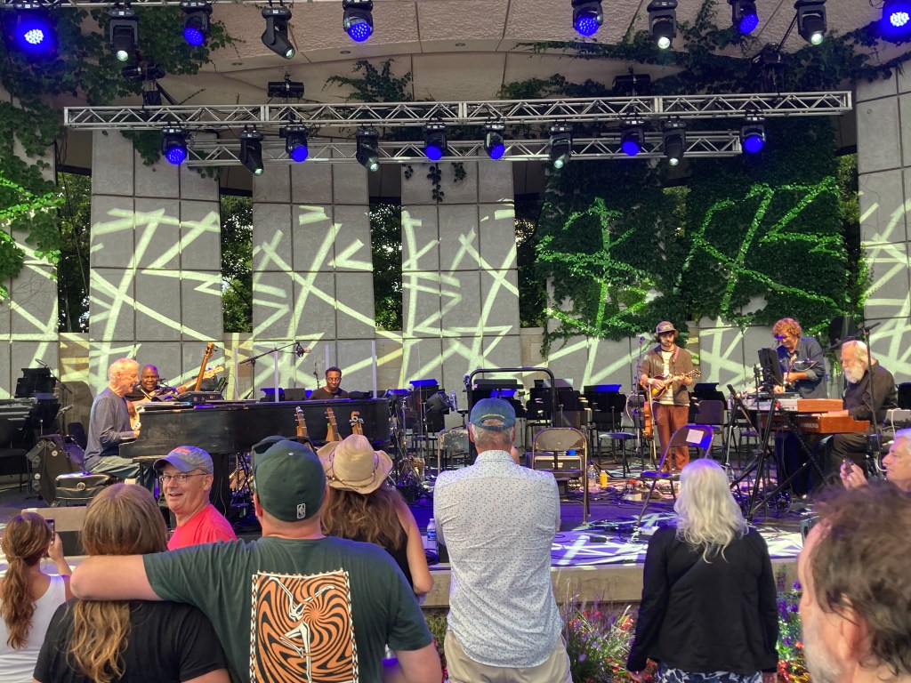 Then the heavens opened: remnants of Hurricane Beryl that had been circling let loose persistent, soaking rain and uncomfortably close rumbles of thunder. As Hornsby launched into one of his solo piano hymns, management pulled the orchestra offstage. Calling an audible with the hit “Mandolin Rain”, Bruce then asked the audience to help with the high-pitched shout chorus he admitted he couldn’t manage; from his response, you could tell we’d covered it to his satisfaction.